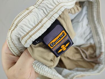 Męskie spodnie 3/4 – beżowe/kaki - Krój: rybaczki/3/4, prosta nogawka - Pas: elastyczny z wewnętrzną regulacją na troczki - Kieszenie: 2 przednie skośne z ozdobnymi guzikami - Dół nogawek: możliwo...
