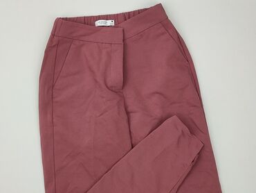 Różowe spodnie damskie typu jogger/chinos - Kolor: pudrowy róż - Fason: nogawki proste, lekko zwężane; mankiety podwinięte na dole - Stan talii: wysoka/średnia - Pas: szeroka, elastyczna gumka zap...