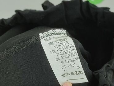 Czarne damskie spodnie z wysokim stanem i marszczoną gumką w pasie. Model z wiązaniem/sznurkiem w talii, zwężane nogawki z podwiniętymi mankietami. Po bokach kieszenie. Materiał: 70% wiskoza, 25% poliamid, 5% elastan – tkanina miękka, elastyczna i przyjemna w dotyku, dobrze dopasowuje się do sylwetki. Rozmiar z metki: L (ART 6027). Uniwersalny, gładki kolor czarny – odpowiednie zarówno na co dzień, jak i do bardziej eleganckich stylizacji. Instrukcje pielęgnacji zgodnie z metką. Made in Italy.
