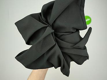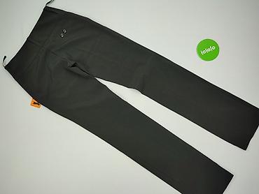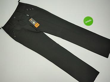 Damskie spodnie materiałowe - Rozmiar: 38 - Krój: zwężane nogawki, średni stan - Kolor: czarny z granatowymi lampasami po bokach i obszyciem pasa - Materiał: 100% poliester; podszewka: 100% polies...