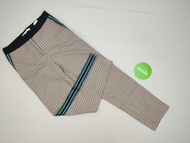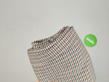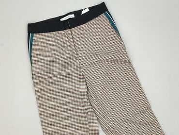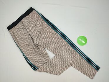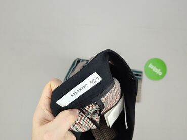 Ciemne spodnie damskie w kratę, marki Reserved, z ozdobnym białym lampasem biegnącym wzdłuż nogawek. Spodnie posiadają zakładki z przodu, dodające im eleganckiego charakteru. Mogą być noszone zarów...
