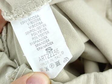 Beżowe spodnie damskie z elastyczną talią w rozmiarze S. Wykonane z mieszanki 63% wiskozy, 32% poliestru i 5% elastanu, co zapewnia wygodę i elastyczność. Spodnie posiadają szlufki na pasek oraz praktyczne kieszenie boczne. Ich prosty krój sprawia, że są uniwersalne i nadają się do codziennego noszenia. Wyprodukowane we Włoszech.