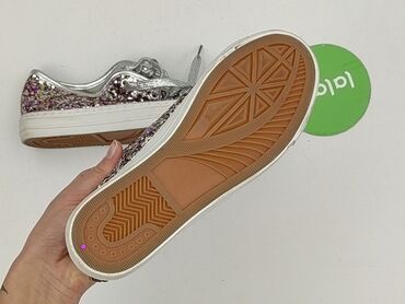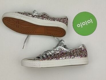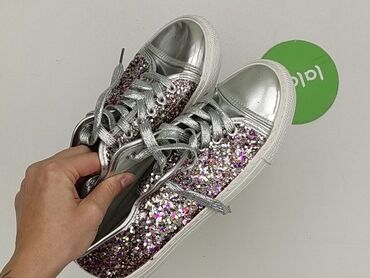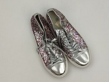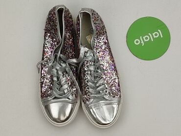 Srebrne trampki damskie z połyskiem - Kolor: srebrny, metaliczny połysk - Model: niskie trampki/sneakersy wiązane - Cholewka: syntetyczna, gładka z efektem lśnienia - Sznurowadła: szare, płaskie -...Stan:
