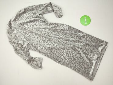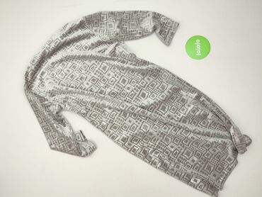 Używana sukienka marki Aniston w bardzo dobrym stanie. Sukienka ma długie rękawy i dekolt w kształcie litery V z czarnym wykończeniem. Wzór na sukience jest geometryczny, w odcieniach szarości, bor...