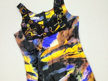 Sukienka damska Bastet, rozmiar 38 - Fason: ołówkowy, bez rękawów, długość do kolan - Dekolt i ramiączka zdobione dekoracyjną aplikacją z marszczeń oraz dużymi ozdobnymi kamieniami - Wzór: intensy...