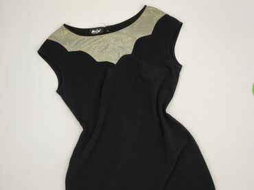 Sukienka damska, rozmiar L. - Fason: ołówkowy, długość midi (przed kolano), z krótkim rękawem - Kolorystyka: beżowo‑czarna, z wyszczuplającymi panelami po bokach - Przód: efektowna, duża aplikacja...