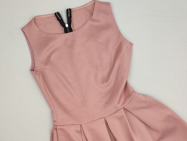 Sukienka damska bez rękawów w kolorze pudrowego różu. - Krój: dopasowana góra, rozkloszowany dół z zakładkami, talia podkreślona. - Dekolt: okrągły. - Zapięcie: suwak z tyłu. - Rozmiar z metki: XS...