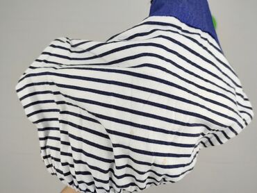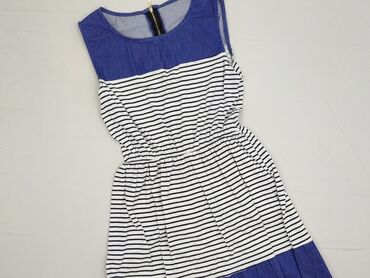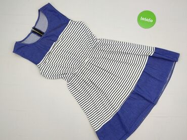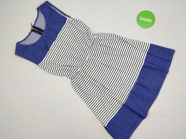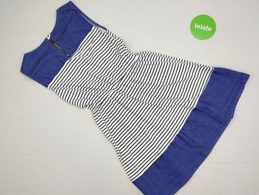 Sukienka damska bez rękawów w marynarskie pasy - Krój: prosty, do kolan, bez rękawów, okrągły dekolt - Wzór: szerokie poziome pasy granatowo-białe; wstawki w kolorze szarym (boczne panele i dół) -...Stan: