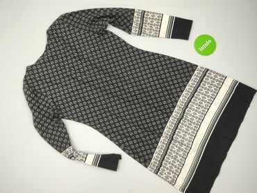 Sukienka damska midi z długim rękawem - Kolor: czarny z połyskującym, złotym wzorem w kropki/owale - Fason: kopertowy dekolt V, odcięcie i delikatne marszczenia pod biustem, rozkloszowany dół - Rę...Stan: