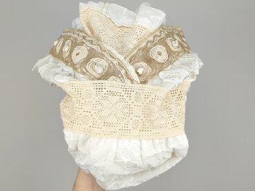- Materiał: lekka, półprzezroczysta tkanina z kwiatowym haftem, wykończenia z koronki i aplikacjami w odcieniu beżu
