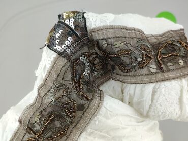 - Ozdoby: taśmy z cekinami wzdłuż dekoltu oraz szeroki pas w talii z misternymi aplikacjami (koraliki, cekiny, haft)