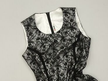 Sukienka damska bez rękawów z koronkowym panelem - Fason: ołówkowy/tuba, długość przed kolano - Kolor: czarny z centralnym panelem z czarnej koronki na jasnym podkładzie (motyw róż) - Dekolt: łódk...