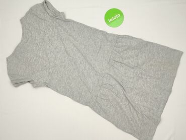 Krótka sukienka damska w kolorze szarym, charakteryzująca się prostym krojem. Posiada krótkie rękawy i okrągły dekolt, a także praktyczną kieszeń na piersi. W pasie znajduje się ściągacz ze sznurki...Stan: