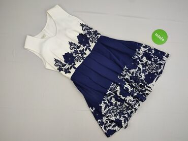 Sukienka damska w kwiaty, rozmiar S - Kolor: granatowy z białym kwiatowym printem - Fason: rozkloszowana, długość do kolan - Dekolt: w kształcie litery V - Rękawy: krótkie, z dekoracyjnymi troczka...