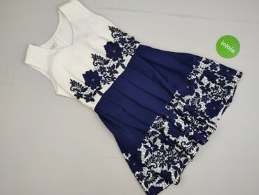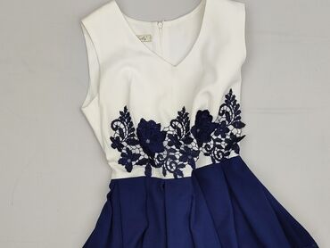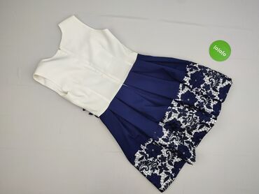 Sukienka damska, rozmiar M. Dwuczęściowy efekt: - góra: kremowa/śnieżnobiała koronka o kwiatowym wzorze, krótki rękaw, zaokrąglony dekolt, delikatne lamowanie przy krawędziach - dół: rozkloszowana ...