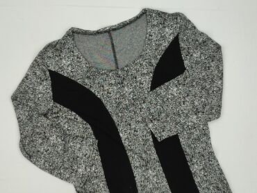 Sukienka dzianinowa damska, tunikowa - Krój: prosta tunika, długość do połowy uda - Rękaw: 3/4 - Dekolt: łódka - Kolorystyka: czarno‑szara, z kontrastowym, melanżowym panelem z przodu; tył gładki ...