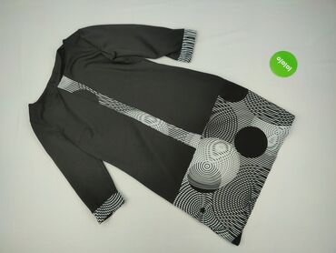 Do pracySukienka damska z dzianiny, kolor czarny z biało‑czarnym, geometrycznym nadrukiem (linie i koła) z przodu oraz na dole tylnego panelu.