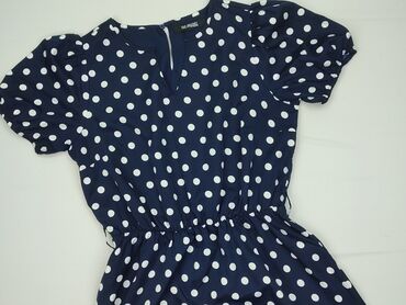 Sukienka damska w grochy - Kolor: granatowy z drobnymi białymi kropkami - Fason: prosta, lekko dopasowana, długość przed kolano - Rękawy: krótkie, lekko transparentne, marszczone - Dekolt: okrągły...