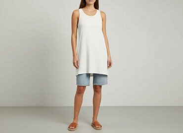 Biała sukienka damska bez rękawów, o długości do kolan. Charakteryzuje się dekoltem w kształcie litery V i paskiem w talii ozdobionym srebrnymi cekinami. Lekka, zwiewna tkanina nadaje jej elegancki...