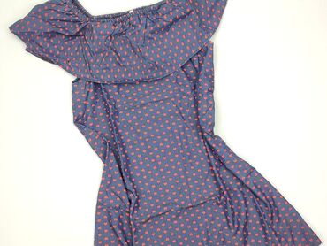 Granatowa sukienka z nadrukiem w różowe serduszka - Krój: rozkloszowany, lekko taliowany, długość do kolan (w zależności od wzrostu) - Dekolt: łódka - Rękaw: krótki - Wzór: gęsty nadruk serc w kol...