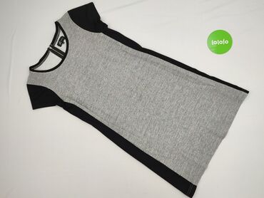 Szara sukienka damska z krótkim rękawem, ozdobiona czarnymi wstawkami po bokach, które biegną przez całą długość ubrania, optycznie wysmuklając sylwetkę. Okrągły dekolt zapinany jest na widoczny, m...Stan: