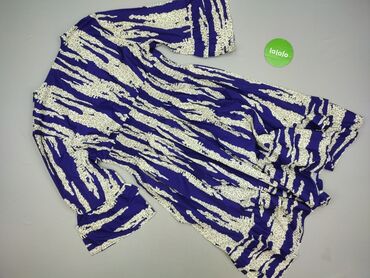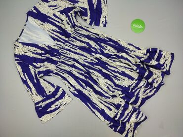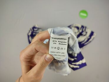 Bezrękawnikowa sukienka damska z dekoltem w kształcie litery V, charakteryzująca się unikatowym, nieregularnym wzorem w odcieniach błękitu i bieli, przypominającym technikę tie-dye lub marmurkowani...Stan: