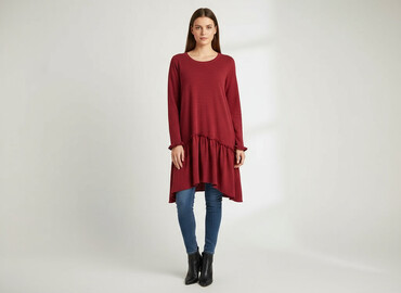 Na co dzieńElegancka sukienka w kolorze bordowym, wykonana z mieszanki akrylu i bawełny, zapewniająca komfort noszenia. Długie rękawy zakończone są ozdobnymi falbanami, dodającymi jej subtelnego uroku. Luźny krój z rozkloszowanym dołem, również z falbaną, tworzy asymetryczną linię, która pięknie układa się w ruchu. Idealna na co dzień, zarówno do pracy, jak i na spotkania towarzyskie.