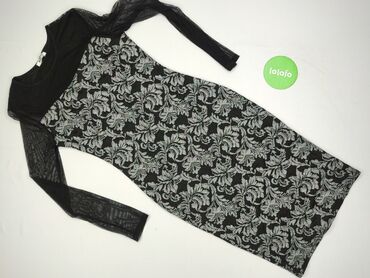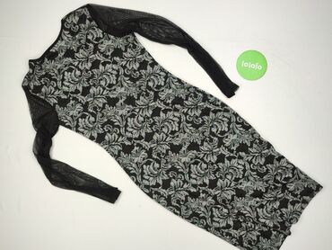 Czarna sukienka damska z długim rękawem, ozdobiona białym kwiatowym wzorem. Charakteryzuje się okrągłym dekoltem oraz elastyczną gumką w pasie, która podkreśla sylwetkę. Rękawy zakończone są delika...Stan: