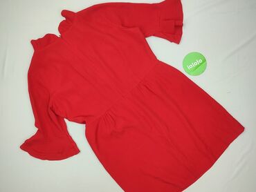 Czerwona sukienka dzienna - Krój prosty, lekko trapezowy, długość do kolan. - Okrągły dekolt. - Rękawy do łokcia z falbaną na zakończeniu. - Gładka, jednolita tkanina o średniej grubości; elastycz...