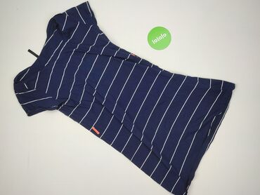 Sukienka damska Moodo, rozmiar S. - Fason: prosty, t-shirtowy, z krótkim rękawem - Wzór: granatowe tło w białe, poziome paski (styl marynistyczny) - Dekolt: okrągły - Talia: wiązana pomarańczowym s...