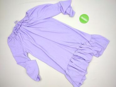 Sukienka damska, kolor jasny lawendowy/blekitny. - Krój: prosty, długość do kolan lub za kolano (midi), dekolt w kształcie litery V. - Rękawy: 3/4 z delikatnie rozszerzaną, marszczoną falbaną przy...