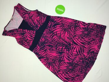 Sukienka damska z krótkim rękawem w intensywny, tropikalny wzór liści na granatowym tle. Najważniejsze informacje: - Rozmiar: 40 (metka widoczna na zdjęciu) - Materiał: 100% poliester - Krój: dop...
