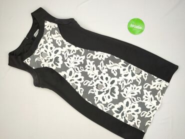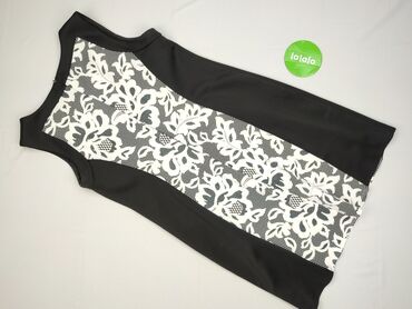 Sukienka damska, rozmiar L. - Fason: ołówkowy, długość midi (przed kolano), z krótkim rękawem - Kolorystyka: beżowo‑czarna, z wyszczuplającymi panelami po bokach - Przód: efektowna, duża aplikacja...