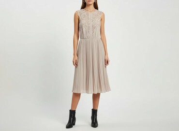 Idealna na wesela, przyjęcia i eleganckie wyjścia; koronkowa góra i plisowany dół nadają całości lekkości i romantycznego charakteru.