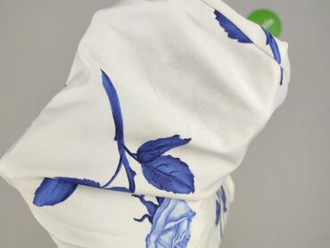 - Wzór: nadruk dużych niebieskich róż z liśćmi na białym tle.