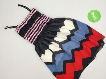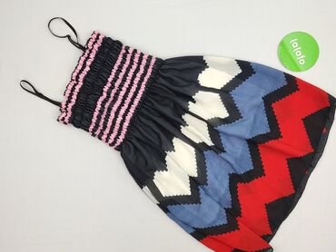 Sukienka damska na ramiączkach z kolorowym, psychodelicznym wzorem - Krój: dopasowana góra, lekko zwężana ku dołowi; długość przed kolano - Ramiączka: szerokie, skręcane, tworzą ozdobne marszczeni...