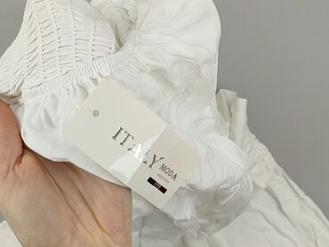 Biała, letnia sukienka boho “Made in Italy”. - Krój: off-shoulder/na odkryte ramiona z elastyczną, szeroką gumką w dekolcie; krótkie rękawy z marszczeniem. - Dół: wielowarstwowa, falbaniasta spódn...