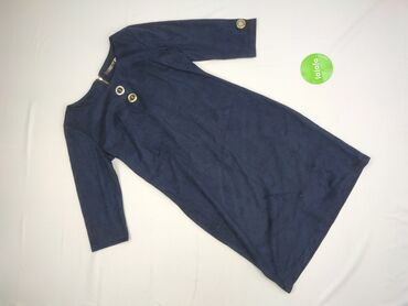 Granatowa sukienka SiSi, rozmiar S. - Fason: prosta, ołówkowa, długość do kolan - Dekolt: łódka - Rękaw: krótki - Zapięcie: kryty zamek z tyłu - Detale: delikatna metalowa plakietka przy dole z pr...