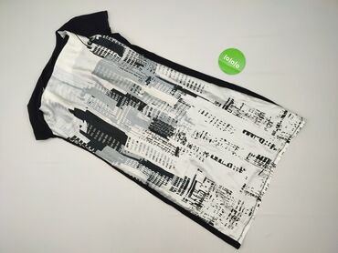 Sukienka damska z dzianiny, rozmiar S. - Fason: prosta, lekko dopasowana, długość mini/przed kolano, rękaw 3/4. - Dekolt: okrągły z czarną lamówką; czarne wykończenia także przy mankietach. - Wz...