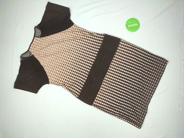 Sukienka damska z dzianiny, ołówkowa, w kolorach beż–karmel–ecru. - Krój: dopasowany, długość za kolano, rękaw 3/4 - Dekolt: łagodnie łódkowy - Zapięcie: zamek na plecach - Wzór: szerokie poziome ...