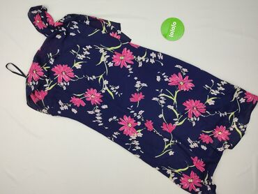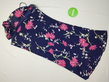 Sukienka damska w kwiaty - Krój: prosty, midi, z krótkim rękawem - Dekolt: okrągły - Kolor dominujący: intensywny kobalt/granat - Wzór: duże, pastelowe motywy kwiatowe (beże, pudrowy róż, biel, zi...