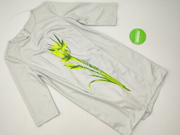 Sukienka damska z lekkiej tkaniny, w szaro-białe kwiatowe wzory. - Krój: prosta, luźna, długość midi. - Dekolt: okrągły, z krótką listwą guzikową z przodu (kilka małych guzików). - Rękawy: 3/4 z de...