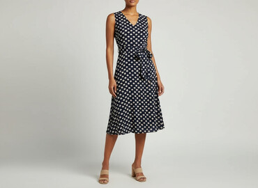Sukienka damska SNOW TRAFFIC, rozmiar M/L - Krój: bez rękawów, góra gładka z okrągłym dekoltem, talia podkreślona wiązanym paskiem, rozkloszowany dół. - Wzór/kolor: granatowa baza z drobnymi jasny...Stan: