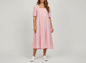 Sukienka damska Tessentials, rozmiar M. - Kolor: jasny róż - Fason: luźny, odcinana pod biustem, rozkloszowana spódnica - Rękawy: krótkie, lekko bufiaste - Dekolt: kwadratowy z elastyczną wstawką ...