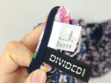 Kwiecista sukienka mini H&M Divided - Rozmiar z metki: EU 38 (US/CA/MX 8), wzrost 165/88A - Kolor bazowy: granatowy - Wzór: wielokolorowe kwiaty (róże, fuksje, zielenie) - Krój: dopasowana góra, r...