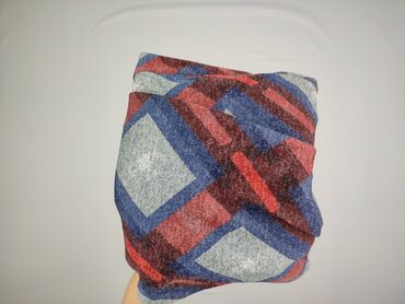 - Wzór: geometryczny, duże kwadraty/romby w kolorach szarości, granatu i czerwieni.