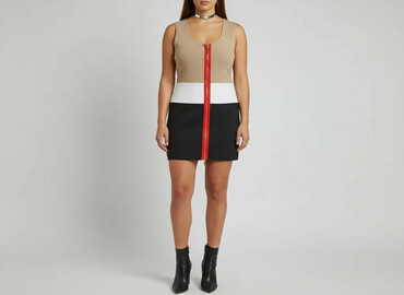 Idealna propozycja na wieczór, imprezę lub eleganckie wyjście; kontrastowe pasy wysmuklają sylwetkę, a elastyczny materiał dopasowuje się do ciała. Zamek pozwala regulować głębokość rozcięcia z przodu.