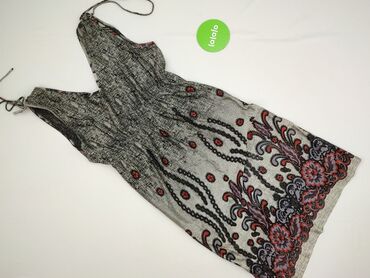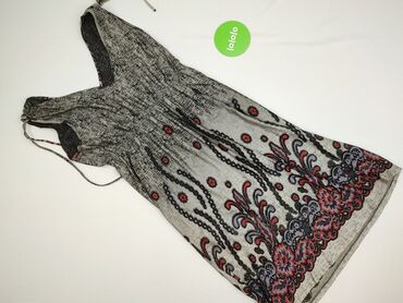 Sukienka letnia na ramiączkach, długość midi. - Kolor bazowy: szary; wzór w kwiaty i rośliny w odcieniach zieleni, żółci, fioletu i czerni. - Góra z marszczeniem/smokingiem – elastyczna, dopasowuje...Stan: