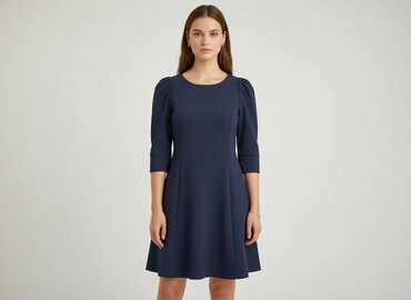 Elegancka, minimalistyczna, idealna na okazje półformalne i biurowe. Klasyczny granat i subtelne bufki nadają sylwetce proporcji, a rozkloszowany dół zapewnia swobodę ruchu.