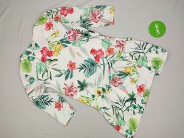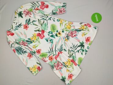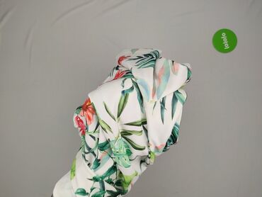 - Kolor i wzór: białe tło, tropikalne kwiaty i liście w odcieniach zieleni, czerwieni, różu i żółci